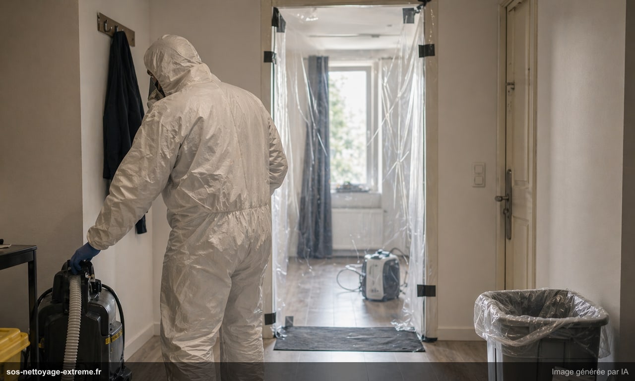 Après un suicide, la remise en état peut nécessiter décontamination, désinfection et évacuation d’éléments souillés selon le contexte transmis.
